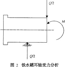 36只鐵水罐耳軸原直徑為φ310 mm,磨損后其直徑分布為φ260 mm ~φ 280 mm不等,鐵水罐中心線偏離原中心線10~20mm。從而導(dǎo)致鐵水罐不能安全使用。而且,耳軸表面凹凸不平也加速對鐵水罐吊鉤襯瓦的磨損。因此必須對耳軸的強度進行校核,并采取相應(yīng)表面修復(fù)措施修復(fù)鐵水罐耳軸。