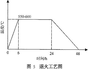 殘余應(yīng)力會引起鋼件在使用一定時間以后,或在隨后的切削加工中產(chǎn)生變形或裂紋。耳軸退火主要用來消除堆焊造成的殘余應(yīng)力、細化金相組織。采用局部退火裝置:制作一鋼筒,鋼筒內(nèi)、外襯石棉,內(nèi)盤電熱絲;鋼筒一端開口,套在耳軸上開口部與包體焊接固定;退火時鋼筒四周覆石棉,鋼包內(nèi)耳軸位置覆石棉;對每只鐵水罐退火過程嚴格按照圖5所示溫度曲線要求。