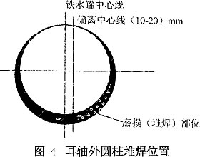 對煉鐵廠100 t鐵水罐的耳軸磨損進行了分析,通過耳軸彎曲強度核算,確認需修復(fù)磨損量。通過對焊縫強度校核,證明更換耳軸的方案不可行,從而選用耳軸表面堆焊的處理工。焊后采用退火處理,以消除焊接殘余應(yīng)力,效果良好。